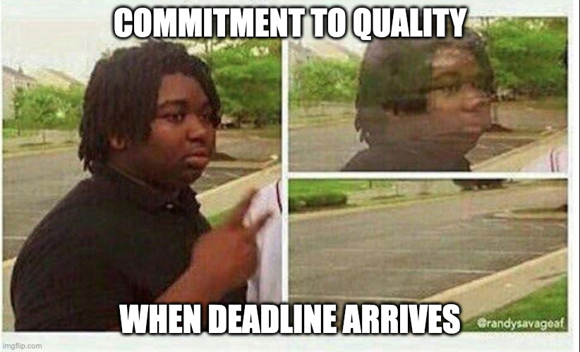 Do not make compromises in quality to get the s*it done! You may win the sprint, but will collapse during the marathon.
